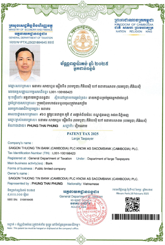 ប័ណ្ណពន្ធប៉ាតង់ឆ្នាំ ២០២៥ របស់ធនាគារសាខមប៊ែងខេមបូឌា កាលបរិច្ចេទ៖ ១៨ ខែកុម្ភះ ឆ្នាំ២០២៥